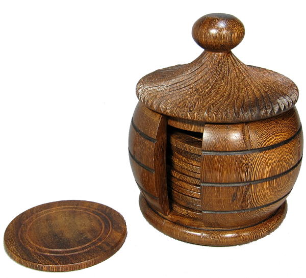 ベナンからやってきたおしゃれなコースターセット。アフリカの村の小屋をイメージしたろくろ挽きのコースターケースとコースター12枚。