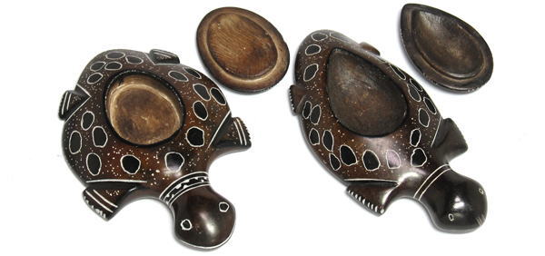 サハラでとれたソープストーンを彫刻・彩色してかわいらしい石のカメの小物入れを作りました。