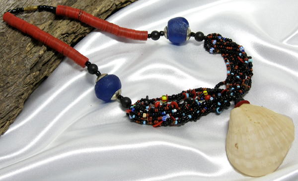 トップに大きな貝殻(二枚貝)をあしらったビーズネックレス。かなり厚みのある貝殻で存在感のあるペンダントに仕上がっています。