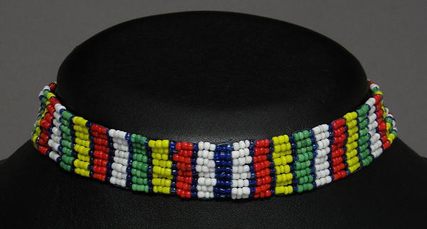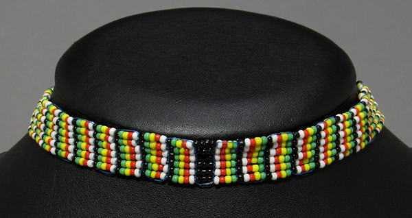 赤・黄・緑のアフリカンカラーを基調としたさまざまな色のシードビーズで幾何文様を描いたチョーカー。