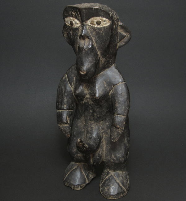 なんともユーモラスな造形が目を惹くの雄ザルの像。黒目部分には金属鋲が打たれています。