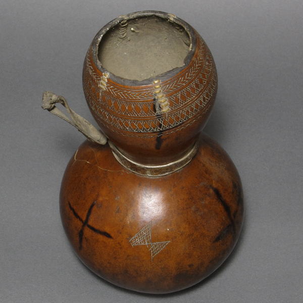 エチオピアからやってきたアンティークのひょうたん容器。ミルクまたは乳製品を入れていたものと思われます(ミルク入りの紅茶を容れるのにも使われるとか)。