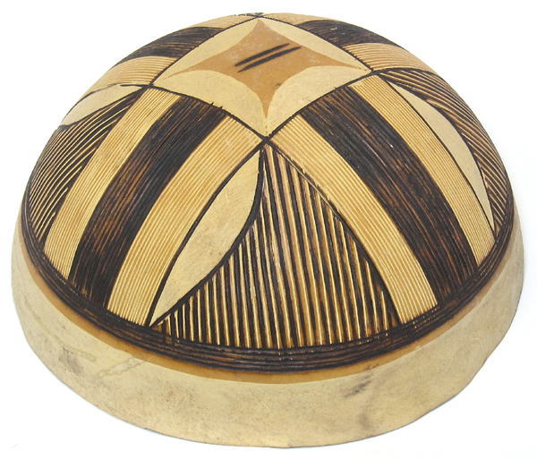 アフリカではさまざまな形のひょうたんが用いられている。球形,細首、ひょうたん型、ひしゃく型、円筒型...中でも西アフリカで一番多く使われているのが球形のひょうたんを半切りにしたボール型のひょうたん容器である。固体、粉末から液体に至るまで様々な物を入れるのに用いるこのタイプのひょうたんは、安価で壊れにくい金属製、プラスチック製のボールが大量に出回っている現在でも、市場、家庭など多くの場所で使用されている。 |