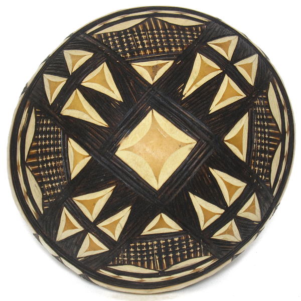 アフリカではさまざまな形のひょうたんが用いられている。球形,細首、ひょうたん型、ひしゃく型、円筒型...中でも西アフリカで一番多く使われているのが球形のひょうたんを半切りにしたボール型のひょうたん容器である。固体、粉末から液体に至るまで様々な物を入れるのに用いるこのタイプのひょうたんは、安価で壊れにくい金属製、プラスチック製のボールが大量に出回っている現在でも、市場、家庭など多くの場所で使用されている。 |